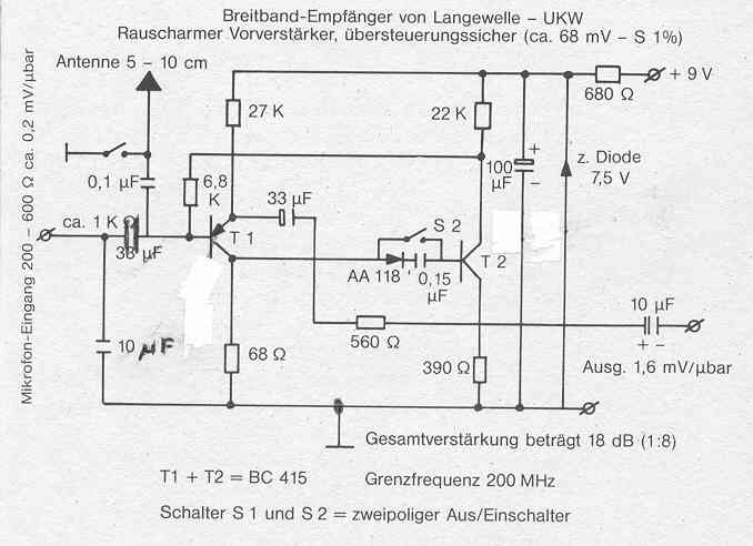 Die Breitbandmethode erzielt sehr gute Ergebnisse, denn bei dem Vorhandensein von derart vielen Frequenzen liegt die Möglichkeit des Stimmenempfangs dementsprechend höher. Dieses Gerät kann alle Wellenlängen zwischen 10 Meter Kurzwelle und 2000 Meter Langwelle empfangen. Hier ein Bauplan, der 1981 von Hans Otto König veröffentlicht wurde.