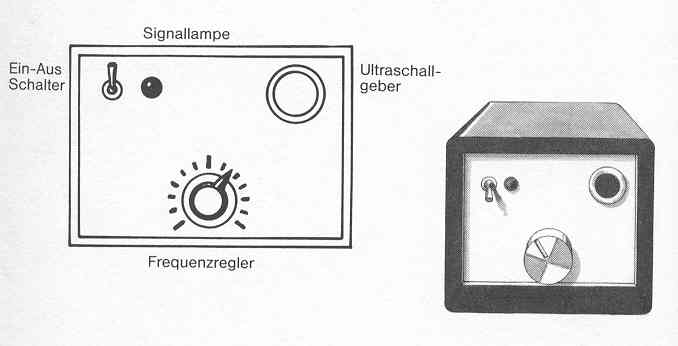 Durch Betätigung des Ein- und Ausschalthebels (beim Einschalten leuchtet die Signallampe auf) wird das Gerät funktionsbreit. Mit dem Frequenzregler versucht man, die günstigste Schwingungsform nach "drüben" einzustellen. Diese muss durch mehrere Einspielungen ermittelt werden. Der Generator soll etwa zwei bis drei Meter entfernt vom Aufnahmegerät (Tonbandgerät oder Kassettenrekorder) aufgestellt werden.