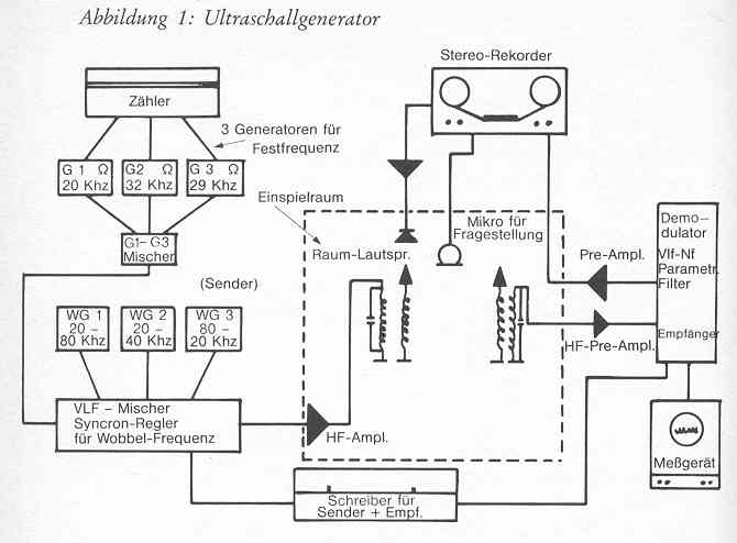 Die drei Wobbelgeneratoren - WG1 - WG2 - WG3 überstreichen mit einer absoluten Synchronisation die von den Jenseitigen durchgegebenen Frequenzbereiche, welche anschließend über einen HF-Verstärker den Jenseitigen als Schwingungsbrücke zugeführt wird. Zwischen Sender und Empfänger entsteht eine Mischfrequenz zwischen der Jenseits- Informationsschwingung und dem angebotenen synthetischen Schwingungsfeld.