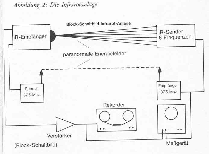 Das Schaltbild der Infrarotanlage zeigt den letzten Stand der Forschung. Die Anordnung ist eine Empfehlung der jenseitigen Freunde. Im Gegensatz zum Generator handelt es sich um eine Apparatur, die ganz auf die Gedankenstruktur der Experimentatoren, auf Hans Otto König und seine Mitarbeiterin, abgestimmt ist.