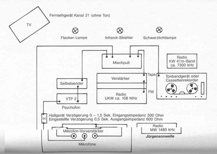 Die beiden Radiogeräte mit der eingestellten Kurzwelle beziehungsweise Mittelwelle haben eingebaute Lautsprecher. Das Radiogerät mit der eingestellten UKW-Frequenz ist über den Verstärker mit zwei externen Lautsprecher - Boxen verbunden. Psychofon. Selbstsender. Die direkte Stimme wurde jeweils über die externen Lautsprecherboxen gehört. Lautstärkeregelung je nach Empfang. Das mitlaufende Tonbandgerät empfängt die Signale der Mikrofone, des Psychofons und das des Selbstsenders. Das Radio (UKW) und der Verstärker sind eine Einheit (Receiver). Bei der Einspielung: Stellung FM. Beim Abhören: Stellung Tape 1. Tape 1 ist mit dem Mischpult (Output) verbunden. |