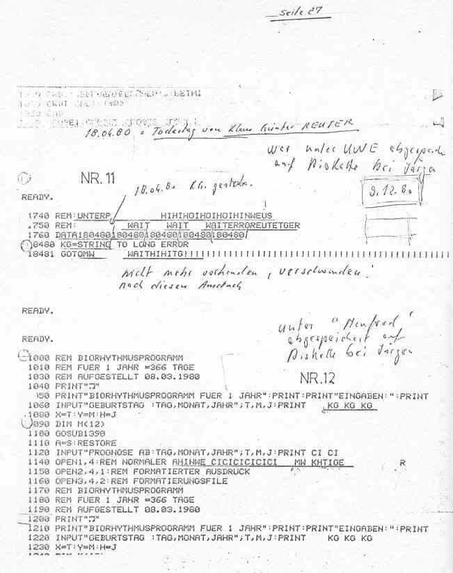 Seit 1979 besitzt Manfred Boden einen Computer mit Bildschirm. Als Extraspeicher benutzt er einen Kassettenrekorder. Als er noch einen Drucker für seinen Computer gekauft hatte, erweiterte er sein bestehendes Biorhythmusprogramm für ein Jahr. An jenem Tag im Oktober 1980 übergab er einem Bekannten, der mit dem gleichen Computer arbeitete wie er, das Biorhythmusprogramm auf einer Kassette.
