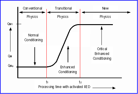Es wurde festgestellt, daß einfach durch die Nutzung eines mit Intention geprägten elektrischen Geräts in dem Laborraum über ungefähr 3 – 4 Monate, das Labor „konditioniert“ wurde, und es war der Zustand dieser „Konditionierung“ der die extrem starken Werte der oben erwähnten Versuchsergebnisse bestimmte! Wonach es unseres Erachtens aussieht, ist in Abb. 1 dargestellt, wobei QM die Größe jeglicher physikalischen Messung M ist.