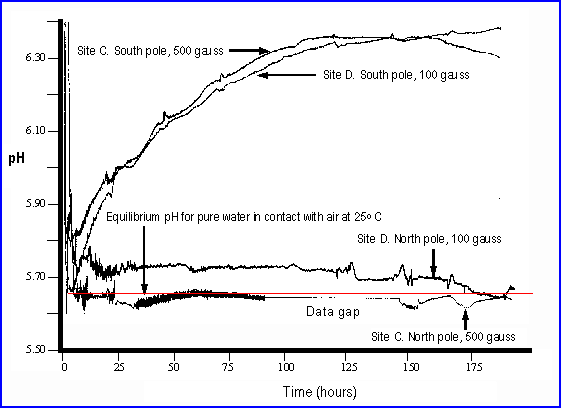 Wir plazierten einen scheibenförmigen Magneten unter unserem pH-Mensurzylinder, und zwar für ungefähr 3 Tage mit nach oben zeigendem Nordpol, dann drehten wir ihn so um, daß der Südpol für ungefähr 3 Tage nach oben zeigte; den pH-Wert des Wassers haben wir selbstverständlich die gesamte Zeit über gemessen.