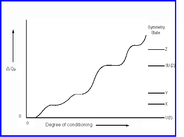 Eine der Abb. 3 zu entnehmenden wichtigen Bedeutungen ist, daß dann, wenn ein Gerät zwischen einem dieser höheren Symmetriezustände X, Y, SU(2), Z, usw. und der Welt der EM-Meßwerte-Symmetrie angeschlossen ist, kann sinnvolle Arbeit jeglicher Spielart vollbracht werden.