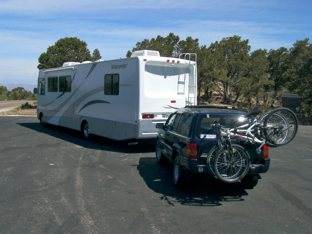 Ein riesiges Womo mit Jeep Grand Cherokee im Schlepp und darauf