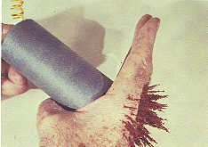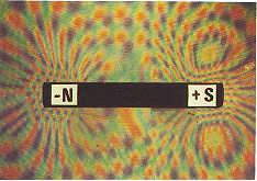 I made this photograph in a laboratory in Puerto Rico. A bar magnet is held by a piece of cellophane tape in front of a TV tube. By this technique I made visible to the eye, the energy fields which surround the magnet. Note that the energy at one end of the magnet differs from that at the other end. Perhaps in high school physics you performed a somewhat less sophisticated experiment by watching the movement of iron filings on top of a piece of paper when you placed a magnet below the paper. The energy field of the magnet moved the small pieces of iron and arranged them in a definite pattern. Such a magnetic energy field is actually three- dimensional. It can penetrate blood, flesh, and bone as shown in this photo. A small but powerful electro- magnet has picked up thousands of pieces of iron filings and arranged them in these lines of force extending above my hand.