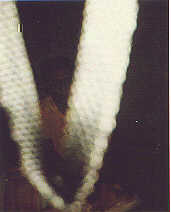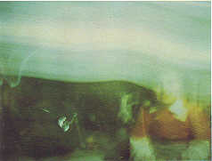 Taken in Germany, the emulsion on the photographic film shows the energy fields (the swirling white bands) generated in the presence of a very psychic small girl. Neither the father who took the picture, nor her mother had any awareness of these energies. The father thought he had wasted his film until I exclaimed in delight at his unique accomplishment in bringing these "invisible" fields into visibility. |