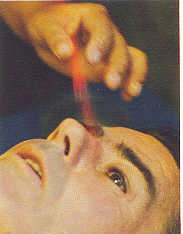 While studying healers living in the rice fields of a northern part of the Philippines, I was fortunate to capture on film this red-orange blast of healing energy. Josefina Sisson is just starting to treat the eye of a patient who has come from the out-back area of Australia. This momentary blast of healing energy was invisible to the members of the 5-man team of specialists I had taken with me but it was detected and recorded by the emulsions on the photographic film. |