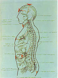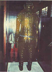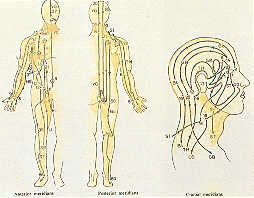 Even though invisible, the reality of these acupuncture meridians has been known in China for more than 1900 years. I took this picture in 1979 in a museum in 500 Chow, China. The large bronze figure in the glass case has small holes drilled at specific points in the acupuncture meridians. The professor of the medical school 200 years ago would coat the figure with a dark colored wax, fill the hollow casting with water and then challenge the medical students to insert the needle in a specific hole on one of the acupuncture meridians. If the student had placed the needle properly, upon its removal he would have a stream of water to confirm his accuracy. |
