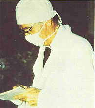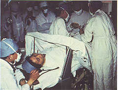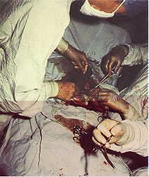 In this case, a middle-aged woman is being operated on for suspected cancer of the stomach. The only anaesthetic is provided by three small needles placed in the periphery of the ear and supplied with a pulsed 3-volt DC current. She was fully awake and could converse with us through the administrator of the hospital, who served as translator. She reported that she felt no pain. |